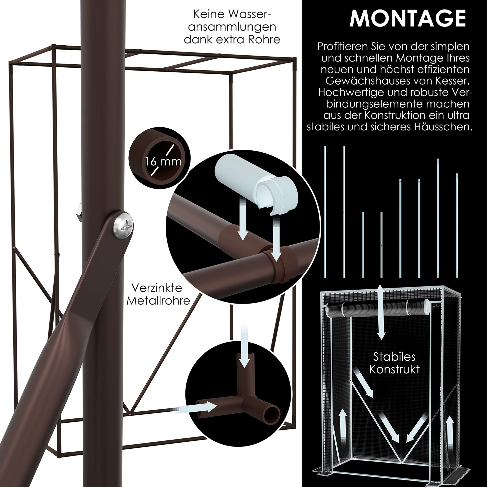 • 𝐇𝐎𝐂𝐇𝐖𝐄𝐑𝐓𝐈𝐆 𝐔𝐍𝐃 𝐑𝐎𝐁𝐔𝐒𝐓: Profitieren Sie von der simplen und schnellen Montage Ihres neuen und höchst effizienten Gewächshauses von KESSER. Die hochwertigen und robusten Verbindungselemente machen aus der Konstruktion ein stabiles und sicheres Treibhaus. Durch zusätzlich angebrachte Rohre ist die Wasseransammlung ausgeschlossen und metallverzinkte Rohre sorgen für ein langlebiges Glashaus.
