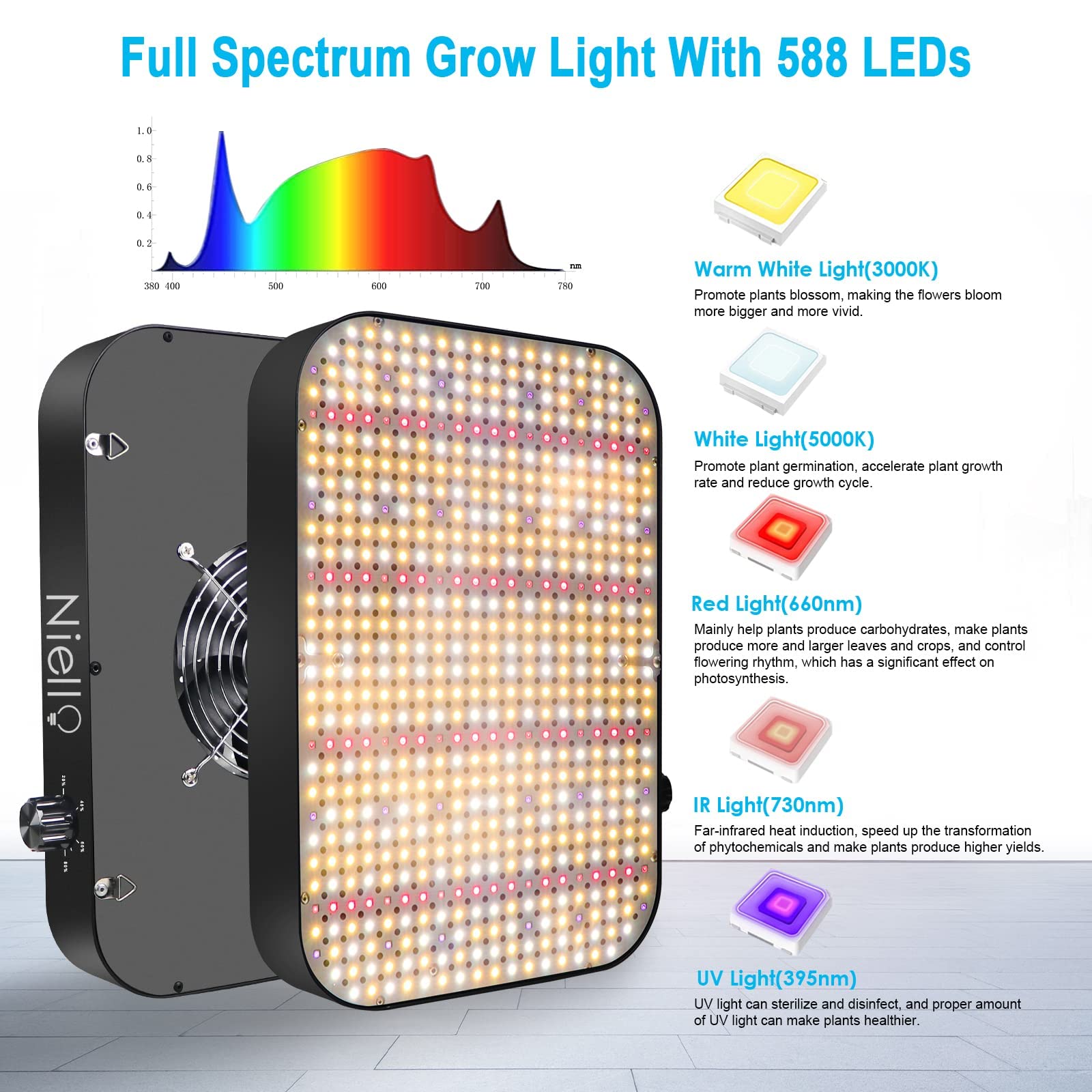 - 𝐕𝐨𝐥𝐥𝐬𝐩𝐞𝐤𝐭𝐫𝐮𝐦 𝐏𝐟𝐥𝐚𝐧𝐳𝐞𝐧𝐥𝐚𝐦𝐩𝐞: Niello LED Pflanzenlampe enthält warmweißes licht (3000k) leds + Tageslicht-leds (5000k) + Rotlicht leds (660 nm) + IR-licht-leds(730 nm), led grow lampe wird Das effektivste Spektralverhältnis und bietet Pflanzen ein gleichmäßigeres Licht, ähnlich wie Sonnenlicht, Sehr gut geeignet für alle Wachstumsstadien von Pflanzen