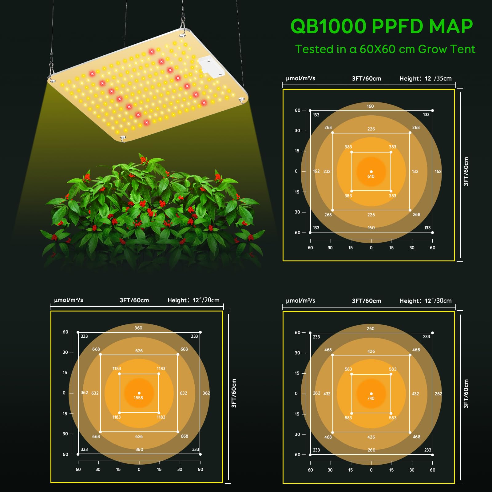 - 𝐇ö𝐡𝐞𝐫𝐞𝐫 𝐏𝐩𝐟𝐝 𝐖𝐞𝐫𝐭: Eine 1000W Wachstumsphotodiode kann eine höhere Nennleistung von ppf / Joule (2,7 umol / J bei 110 V Wechselstrom) liefern, und der ppfd-Wert für die Lichtleistung beträgt 274,85 umol / s. Pflanzenlampe led die das Pflanzenwachstum von Blättern fördern, Blüte fördern und Wachstumsgeschwindigkeit effektiv erhöhen, und heller machen und mehr Blätter und Pflanzen produzieren