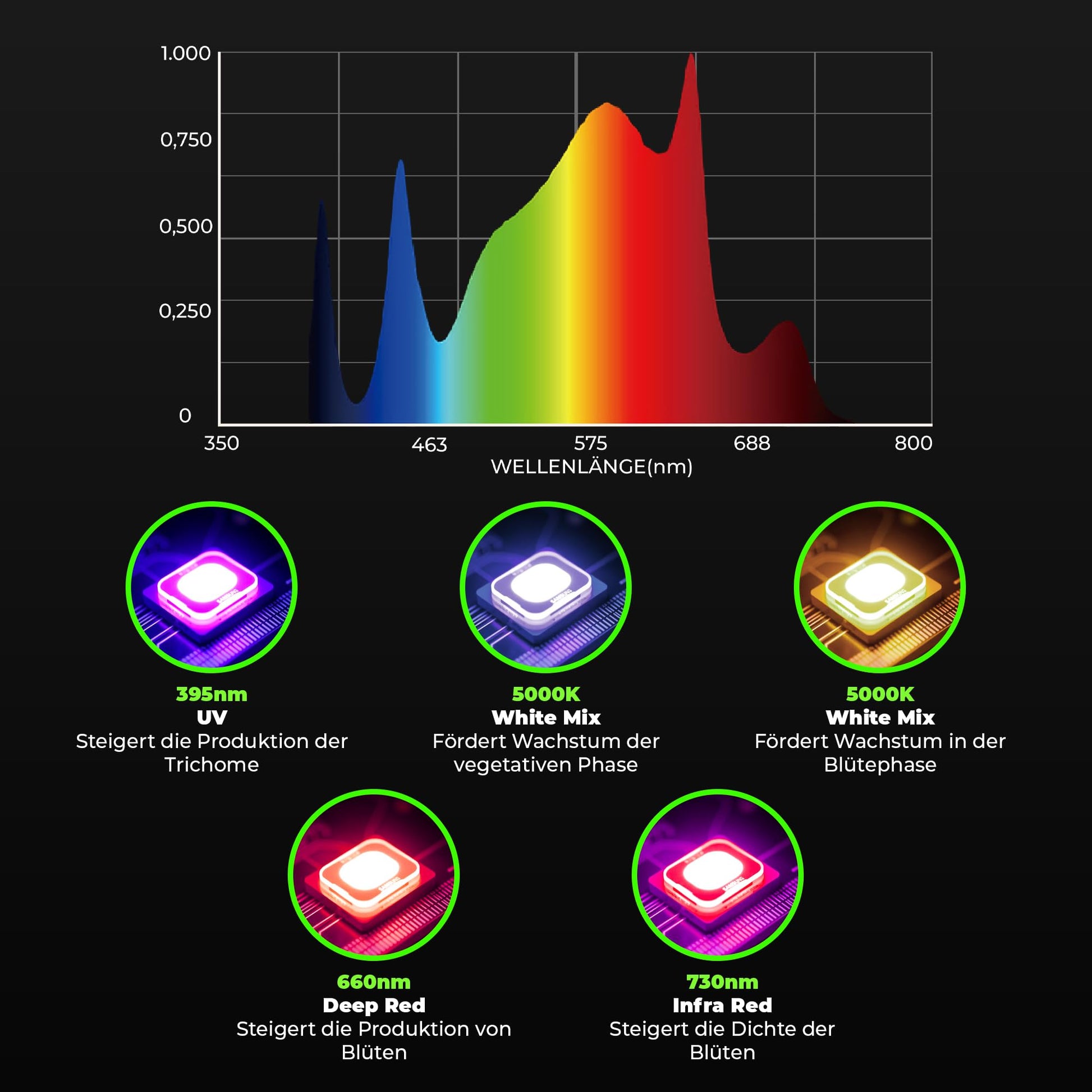 • INNOVATIVES PROLINE VOLLSPEKTRUM: Das von uns entwickelte Vollspektrum, welches sowohl UV als auch Infrarot Dioden beinhaltet, simuliert natürliches Sonnenlicht perfekt. Somit wird der Ertrag massiv gesteigert.