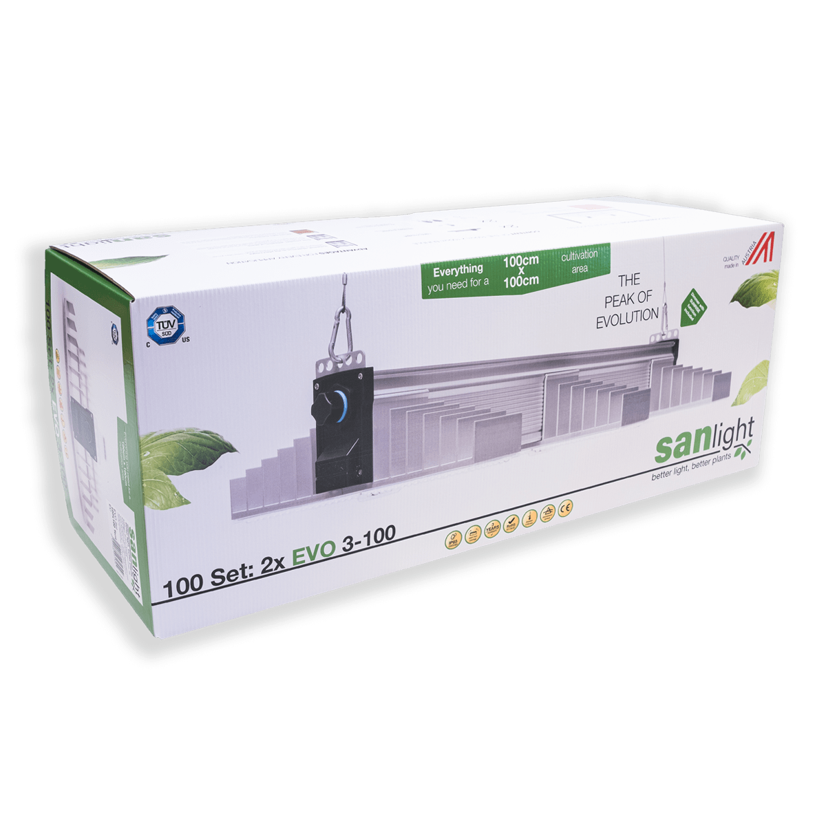 Das SANlight Set ist speziell für kleinflächige Indoor-Setups von 100x100cm konfiguriert. Neben der leistungsstarken EVO-Lampe(n) sind auch Kabel, Hänger und Dimmer für unkompliziertes Plug+Play beigelegt.