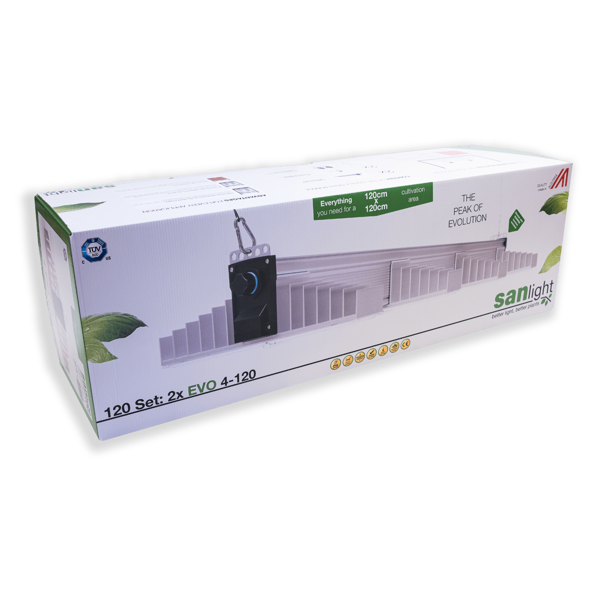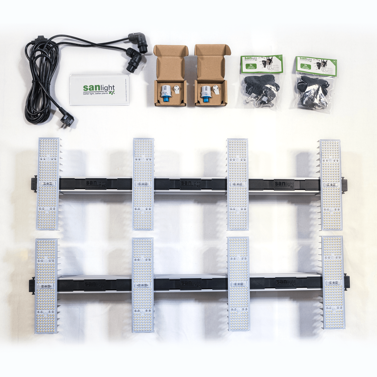 Das SANlight Set ist speziell für kleinflächige Indoor-Setups von 120x120cm konfiguriert. Neben der leistungsstarken EVO-Lampe(n) sind auch Kabel, Hänger und Dimmer für unkompliziertes Plug+Play beigelegt.