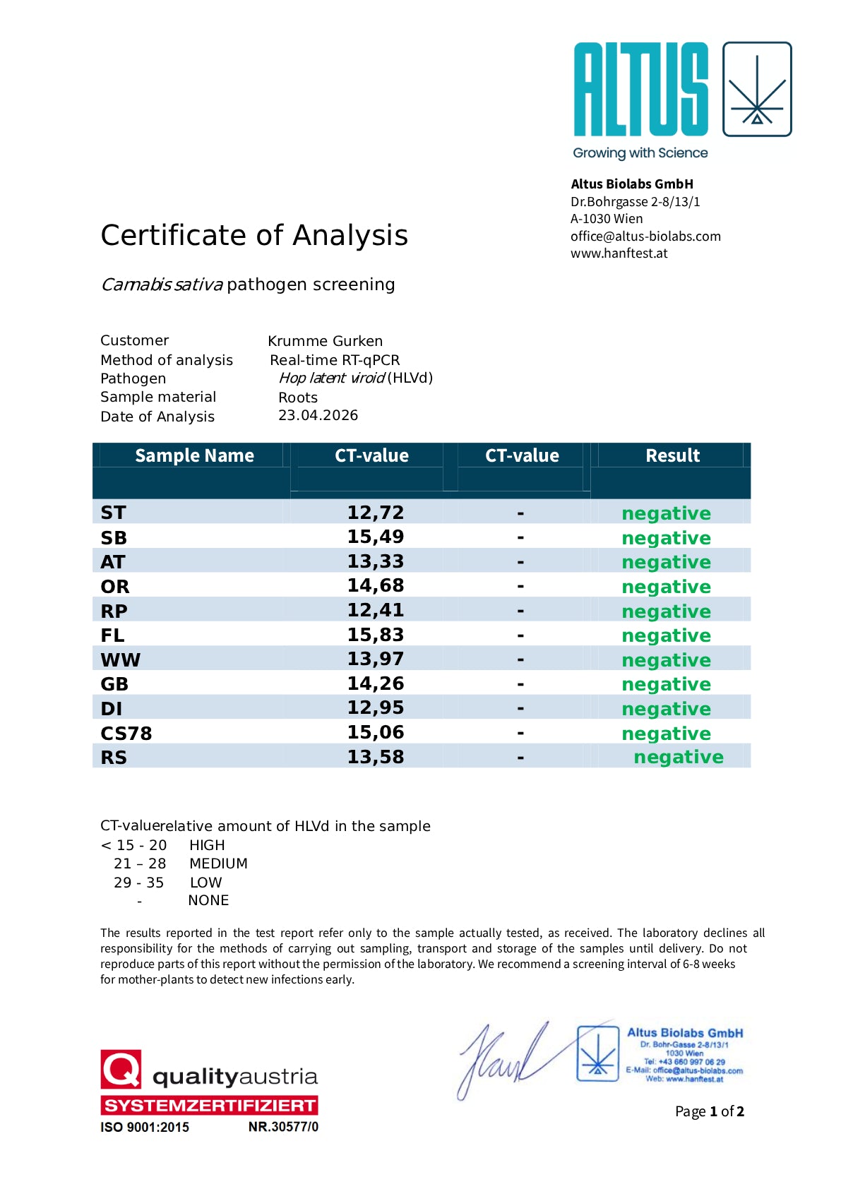 Laborzertifiziert frei von Krankheiten durch ALTUS BioLabs.